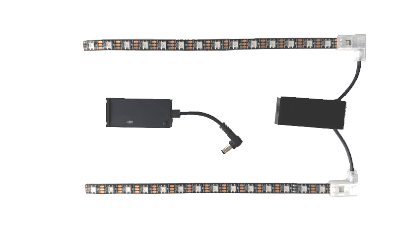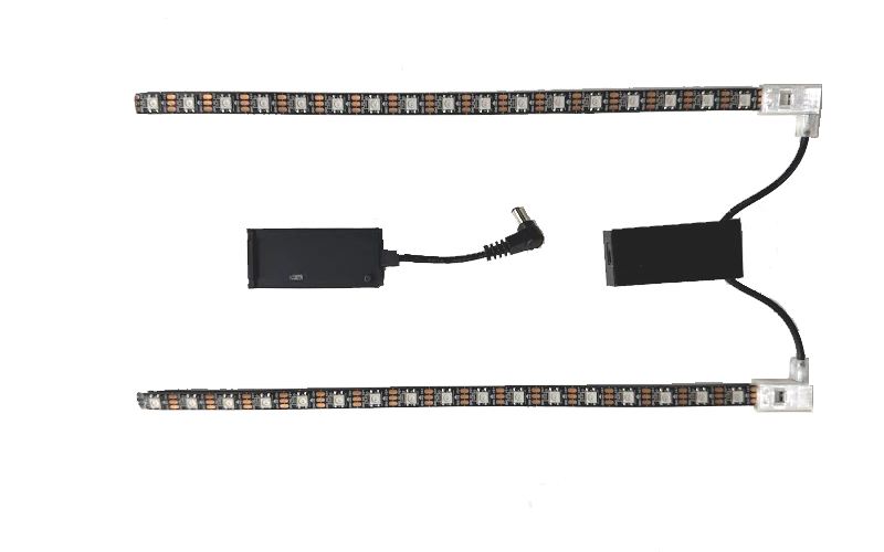 The CoyoteDazzler is constructed with multiple LED lights mounted on a strip. Each of the LED's is independent and can produce any color. A small controller connects to the LEDs and commands them to display beautiful patterns of light. The kit includes a small rechargeable battery, a controller, and two RGB LED strips that easily attach to the back of a CoyoteVest, SpikeVest, SpikeJacket, or BullyVest.