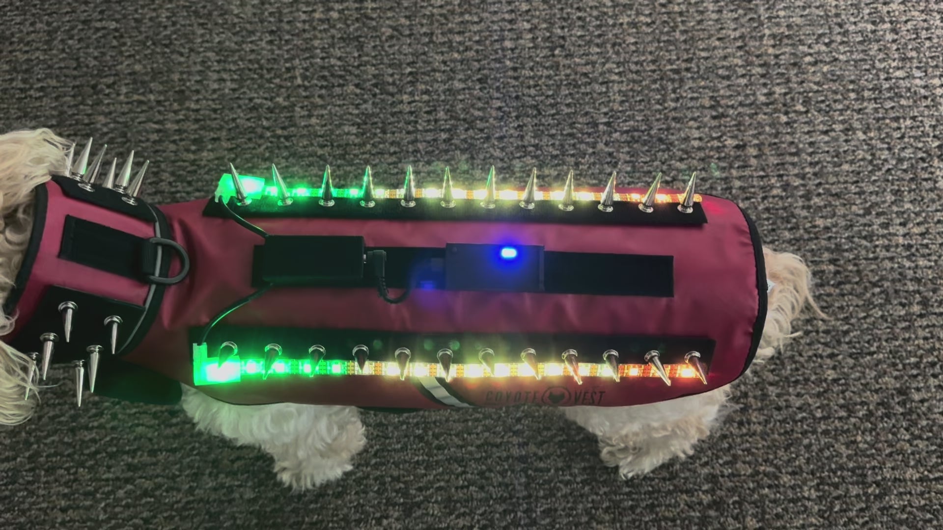 My little guy wears a Spike Vest (he’s 15 pounds and wears a size small) and these Coyote Dazzler lights add not only another safety feature because cars can see him but coyotes will definitely stay away as the lights are moving. I really love the look of them on his Spike Vest and feel like he is SO MUCH SAFER wearing them! Thank you for such an amazing product!!